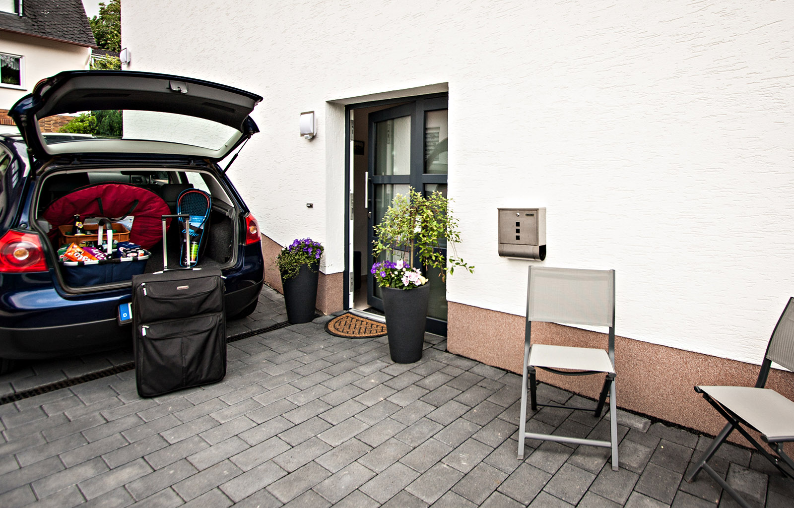 - Parkplatz vor dem Eingang (2 Autos passen hintereinander auf unser Grundstück)